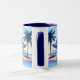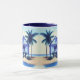 Coffee mug in a charming beach house with a veranda stands nestled between two tall palm trees, facing a serene ocean under a bright, clear sky.