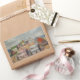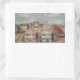 This sticker features an original oil painting by Anna Unterman of a little island off the New Jersey shore. A whimsical grouping of beach houses is clustered around a central sandy courtyard with a colourful clothesline full of laundry blowing in the breeze. Each house is a different pastel colour: pink, blue, white, green and brown. The bay is in the background with one sailboat. The sky is partly cloudy. Reprinted with permission from the estate of Anna Unterman. All rights reserved.