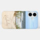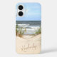 Tropical beach themed phone case with a photo of the seashore with sand dunes and sea grasses, with waves in the background and customisable name or text of your choice.