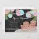 Pink, aqua and coral paper lanterns over adirondack chairs, beach theme couple's shower invitation.