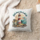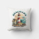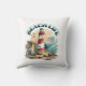 Beach themed throw pillow. Illustration of a beachy scene with lighthouse, surfboards, palm trees and dolphin.