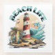 Beach House Décor. Illustration of a beachy scene with lighthouse, surfboards, palm trees and dolphin.