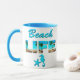 Coffee mug with the caption "Beach Life" embellished with an image of a sandy beach and palm trees, and a seahorse and starfish