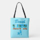 Bag with the caption "Beach Life" embellished with an image of a sandy beach and palm trees, and a seahorse and starfish