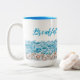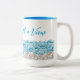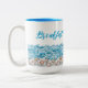 Beach coffee mug with seashells and ocean waves design. Customize the script in sea blue color, "Breakfast with a view" is the sample saying, which you may change. Shown on the taller 15oz. mug or choose the smaller size. This style has a matching blue interior color.