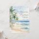 An elegant wedding invitation for a beach wedding, destination wedding. A watercolored sandy beach, ocean waves and palm trees as background.