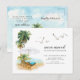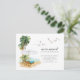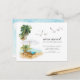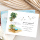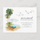Modern watercolor beach scene with two beach chairs, white umbrella, palm trees & seagulls coastal moving announcement.