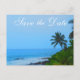 Pretty postcards for save the date to guarantee that family and friends of the bride and groom have ample time to mark their calendars and save your special date! A delightful design featuring tropical palm trees at the shoreline by the ocean.