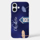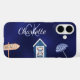A navy blue background.The blue colour is uneven.Decorated with a beach sign, beach hut and an umbrella. Personalise and add a name and monogram initials. The name is written in white with a modern hand lettered style script.