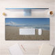 The photo featured on this desk mat captures the brown sand leading to the rolling surf. The blue ocean appears under the brighter blue sky with a few puffy clouds.