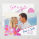 This elegant beach destination wedding save the date features features your own photo over tropical floral elements of beautiful pink and white plumeria flowers that have been given a modern watercolor effect. This is the perfect invitation for the couple having a wedding in Hawaii, or Hawaiian or tropical theme wedding, or beach wedding. Easily personalised with your own wedding information. Photograph of the plumeria and design by T.K. Goforth, all rights reserved.