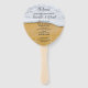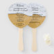 Beach wedding double-sided fan program. Golden beach sand and white surf image is the background for black calligraphy printed text with templates on both sides. Buy as a kit which comes with sticks and glue dots and assemble yourself, or pay extra to receive them already made.