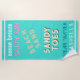 Pretty turquoise blue green background with geometric white stripes. Fun beach themed typography including Beach sand, Ocean breeze, Seashells in various fonts in white, pink, tan and blue. Geometric white stripes on each end. Original Design by TamiraZDesigns.