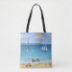 This tote bag is perfect for a vacation at the beach. It's a beautiful, serene beach scene done in watercolor paints. There's a sailboat, lighthouse on a distant shore, seagulls, crystal clear blue water, seashells and a sand dollar on the beach. Personalise it with your name at the bottom.