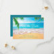 This Save the Date card features a beautiful beach scene with sand, waves, palm tree branches on the corners, and the horizon. This tropical looking design is perfect for a Sumer Wedding, Beach Wedding, Ocean Front Wedding, or Destination Wedding. The colours are bright yet soothing, and the relaxing scene complements the elegant text.