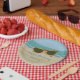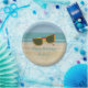 Painting of a beach scene of sand and ocean, with an inlaid image of painted sunglasses, decorate these personalised birthday paper plates. Easily customise the name or message, on the template form.