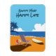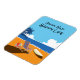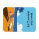 Beach scene with Surfer, chair and bright orange and blue as the dominant colours. The scene is designed as a look back to the 70s era printmaking. What a sunny bright and colourful beach scene on an all over print tote bag. The saying "Happy Mind, Happy Life" is completely customisable and can be changed to anything you'd like or eliminated together. A nice sized magnet to fill an empty space on a metal file cabinet or perk up your refrigerator.