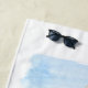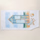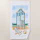 A cute watercolor beach hut with sand, sky and ocean and beach chair and ball. Whimsical beach towel style for a beach house, bed and breakfast cottage or coastal design bathroom home decor.