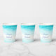 Personalise these beach abstract watercolor art with white graphic waves wedding paper cups with your own couple's names and wedding or event date. Ideal for a beachside outdoor party or to hold confetti in at a beach or coastal themed wedding. © Original watercolor art design by Sarah Trett. www.sarahtrett.com for www.mylittleedenweddings.com