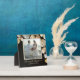 Stand up photo frame with beach shells for newlyweds or couples celebrating a special anniversary. Dark wood is the background image with a scattering of tropical seashells around the top and right side. These are my seashells and my design, so won't be found elsewhere. The picture is square and is framed in a light beige border. Names and date text goes beneath the photo in a very modern script font. Easily change the font style in the customise area, or contact me for help.