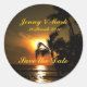 Personalise these save the date wedding envelope seals which feature sunset along the shoreline as the sun dips behind palm trees.