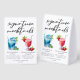This chic beach signature mocktails table tent sign features simple black typography above 2 seaside drinks and their ingredients for your coastal party. A cute Blue Hawaiian sunrise drink and non-alcoholic Strawberry Daiquiri drawing add a cool flair to your bar menu. Complete with the couple's names and date for their reception.