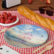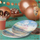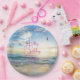 Custom party paper plates with text in centre and beach scene image. An ocean sunrise with waves at the shore and birds flying is the image on round or square paper plates. Bright fuchsia pink text in the centre can be customised for a birthday party, congratulations, graduation or any event. A modern font with extra large first letter is used. Personalise with the honoree’s name.