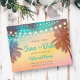 This colourful Save the Date Postcard features a beach scene at sunset with palm trees, a warm sky and hanging lights. The design is perfect for a Summer Wedding, Beach Wedding or Destination Wedding. The illustration and colour palette have a vintage retro feel, while the string lights add a modern and chic touch.
