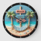 Decorative clock design displaying a serene beach scene with a hammock, palm trees, and ocean view, evoking relaxation and coastal vibes.