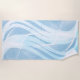 This beach towel is shown in a abstract art print of flowing lines in colours of light blue and white.