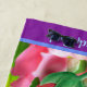 Large beach towel Ladybug flower garden. Purple edge. Ladybug being chased by friendly Snapdragon flowers.