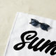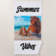 BEACH TOWEL WITH UNIQUE PAINTING OF GIRL/WOMAN ON BEACH WITH SUNGLASSES ON AND HAIR IN BREEZE.SUMMER VIBES AND FUN FLIRTY SUNNY FEEL