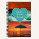 Coastal themed notebook to personalize with a title. Sunset over the ocean, with two beach chairs and umbrella. A big, aqua color heart is where the text goes. Birds are flying along the top of the cover. This is a great design for any beach lover, and is perfect for a teenage girl. Personalize with a name, or any title. The notebook comes in two sizes.