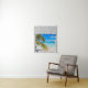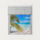 Beach and blue tropical seas, fake window scene, for a windowless bathroom or office wall. Fun, realistic optical illusion scenic tapestry for an office or study wall.