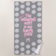 This volleyball themed beach towel features the mixed typographic phrase, "The beach volleyball court is my happy place" in pink and white and custom player monogram on a medium grey background with surrounding small white volleyballs pattern - by katz_d_zynes