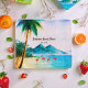 Beach Cutting Board with Watercolor beach art, blue green scenery, palm trees, mountains and flamingos. Use personalise this template to change text. More products with this design are in the collection below.