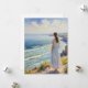 A woman stands on a cliff, gazing out at the expansive ocean under a bright sky. The scene captures a peaceful moment as waves gently roll towards the rocky shore.