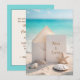A blank card and envelope rest on a sandy beach surrounded by seashells, a starfish, and a turquoise ocean background..