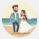 Includes 20 small stickers on one sheet. Cute cartoon sticker featuring a smiling bride and groom on a beach, perfect for wedding celebrations.