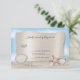 Beach RSVP cards, exclusively designed by Artistically Invited, for a beach themed wedding with sea shells, sand dollars, a starfish, and a message, over a blue sky. They're designed to match the Message from a Bottle Beach invitations.