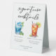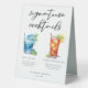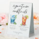 This chic beach signature cocktails table tent sign features simple black typography above 2 seaside drinks and their ingredients for your coastal wedding bar. A cute Blue Lagoon and Long Island Iced Tea drawing add a cool flair to your bar menu. Complete with the couple's names and date for their reception.