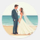 Includes 20 small stickers on one sheet. Adorable illustration of a bride and groom on the beach perfect for wedding decorations.
