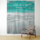 Coastal turquoise white wedding beach themed decor. Nautical summer ocean waves tropical reception photo booth tapestry backdrop. Beautiful, chic, trendy, modern, cool, elegant custom banner. Mr and Mrs, names and date white typography can be changed. Image copyright Marg Seregelyi Photography.
