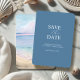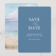 Designed for destination weddings and beach lovers, this save the date features a mix of classic and script typography in white over a rich blue background. The back showcases a stunning watercolor beach scene with ocean waves, setting the perfect tone for your seaside celebration.