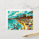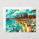 Keep in touch with this pop art comic book style art with a vintage vibes, Art depicts people having fun on the beach shoreline with hotels and and apartments buildings in the background, pretty palm trees, colourful umbrellas and a gorgeous blue cloudy sky. Keep in touch, saying hi and I miss you souvenir postcard.