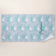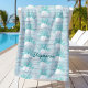 This personalised coastal beach towel features a pattern of aqua glitter, white starfish, and sand dollars on a rustic driftwood background, with script name.