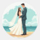 Includes 20 small stickers on one sheet. Whimsical wedding sticker featuring a couple on the beach, perfect for adding a romantic touch to any gift or decor.