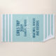 Personalised Teal and White Beach Towel for Your Girls Weekend Friends Trip, Beach Vacation, or Cruise with editable text and wording for your date, destination or location, name, and fun quote like "beaches, booze, and besties" is a fun keepsake for your bachelorette travel squad or bridesmaids.
