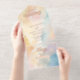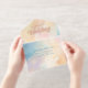 Set the tone for your celebration with this beachy sunset gradient rose gold foil all-in-one wedding invitation. Featuring soft watercolor washes inspired by coastal sunsets — warm peach, champagne, blush, and ocean-kissed blue — this romantic design captures the glow of golden hour by the sea.