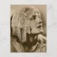Sepia toned vintage photograph of a beautiful young lady in a twenties style beaded and pearl covered hat.Her dress is similarly covered with pearls and beads and she's wearing pearls around her neck.